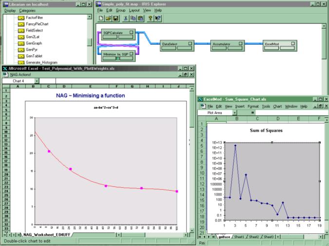 Figure 1. Using modules from the STABLE project to perform a non-linear optimisation with two Excel-based modules. The instance of Excel on the left (started by the SQPCalculate module in the map) is displaying the data points and the cubic that is being fitted to them. The module communicates dynamically with the Minimise by SQP module in the map; this uses a routine from the NAG Fortran Library to perform the optimisation by minimising the sum of the squares. The output from the SQPCalculate module is passed to the ExcelMod, which uses another instance of Excel to display the sum of the squares as a function of iteration number.