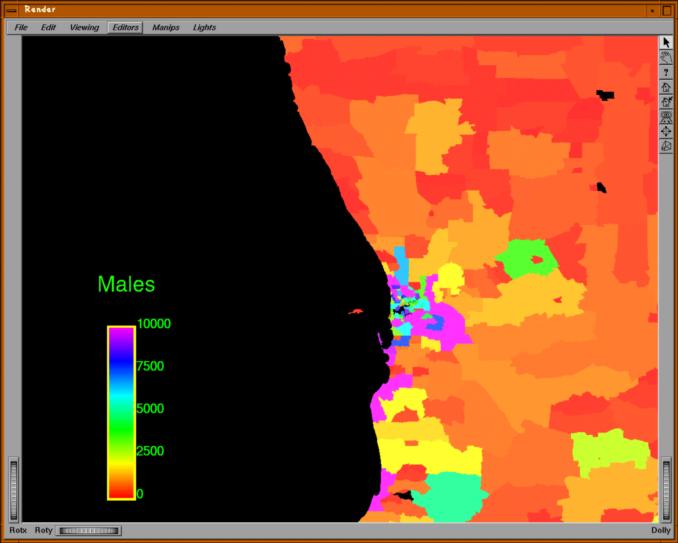 Dynamic generation of thematic maps of census data from Western Australia using IRIS Explorer. The dataset has been read in from files written in the MapInfo MIF format. Here, the postal regions are coloured according to the male populations; the application allows users to select other discriminants from the database, and to explore correlations between these. Visualisation courtesy of Curtin University.
