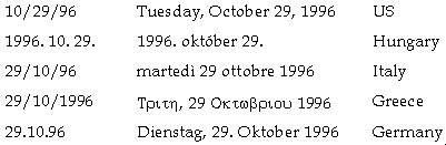 Local conventions also determine how time and date are displayed. Some countries use a 24-hour clock; others use a 12-hour clock. Names and abbreviations for days of the week and months of the year vary by language.