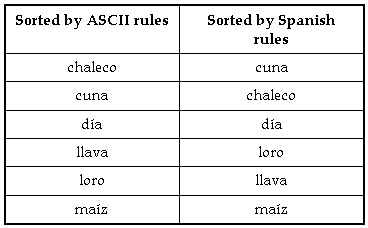 , because in Spanish ll is a digraph[2], i.e., it is treated as a single character that is sorted after l and before m. Similarly, the digraph ch in Spanish is treated as a single character to be sorted after c, but before d. Two characters that are paired and treated as a single character are referred to as a two-to-one character code pair.