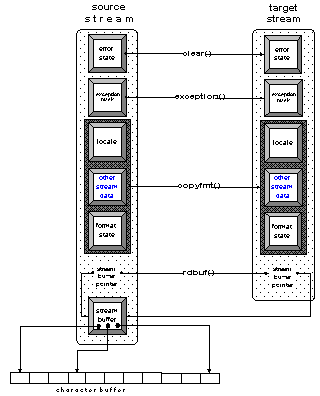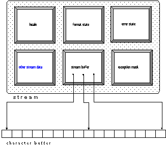 Let us see why. The copy constructor and the assignment operator for streams are not defined; therefore, the compiler-generated default copy constructor and assignment operator are used. As usual, they only copy and assign a stream object's data members, which is insufficient because a stream object holds pointers as well. Figure 14 is a sketch of the data held by a stream object: