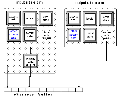 Notice that there is a difference between the solutions that you can see by comparing Figure 17 and Figure 18. An input and an output stream that share a stream buffer, as shown in Figure 17, can still have separate format settings, different locales, different exception masks, and so on.