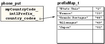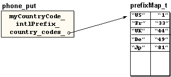 Let us now deal with the problem of adding the international country codes that were omitted from the previous class declaration. These country codes can be held as a map of strings that associates the country code with a mnemonic for the country's name, as shown in Figure 15: