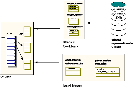 A locale object maintains a set of facet objects. Each facet object has an identification that serves as an index to the set of facet objects. This identification, called id, is a static data member of the respective facet class. Whether or not a facet object will replace another facet, or be an actual addition to the locale object's set of facet objects, solely depends on the facet's identification.