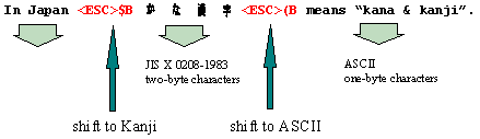 For encoding schemes containing shift sequences, like JIS, it is necessary to maintain a shift state while parsing a character sequence. In the example above, we are in some initial shift state at the start of the sequence. Here it is ASCII. Therefore, characters are assumed to be one-byte ASCII codes until the shift sequence <ESC>$B is seen. This switches us to two-byte mode, as defined by JIS X 0208-1983. The shift sequence <ESC>(B then switches us back to ASCII mode.