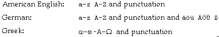 Languages may vary regarding collating sequence; that is, their rules for ordering or sorting characters or strings. The following example shows the same list of words ordered alphabetically by different collating sequences: